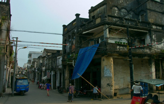 據(jù)史書記載,定安古城從籌建到1519年竣工共費(fèi)時(shí)13年。城圍長(zhǎng)近千米,高四米多,寬五米多,開有東、南、西城門,各建有城樓。北門是1545年才開的,后來因不堪倭寇的騷擾,曾經(jīng)堵上過,直到1690年才又重開。古城的城墻在建國(guó)初期就已經(jīng)被拆毀了,城門這一塊大概是因?yàn)榭此Y(jié)實(shí)牢固,便利用來建了樓房,因此還被保存下來。城門洞里放著兩只卸了龍頭的龍舟,已經(jīng)很舊,架在木樁子上。地是用青石板鋪設(shè)的,經(jīng)過幾百年人來人往,石板被磨得很薄。門洞里的墻面上也是一塊塊青石磚砌的,摸上去很干爽,一點(diǎn)也沒有陳年的霉味。