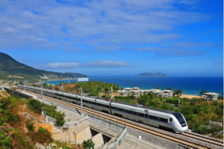 環(huán)島鐵路:海南環(huán)島鐵路由海南東環(huán)鐵路和海南西環(huán)鐵路組成,連接海口至三亞,東環(huán)308千米,西環(huán)345千米,主要運(yùn)行動(dòng)車組,是全球首條環(huán)島高鐵。它的建成,將有利于優(yōu)化產(chǎn)業(yè)布局,帶動(dòng)縣域經(jīng)濟(jì)協(xié)調(diào)發(fā)展;高鐵牽引動(dòng)力為電力,沒(méi)有廢氣排放,能源消費(fèi)量低,對(duì)海南建設(shè)生態(tài)省和節(jié)約型社會(huì)將發(fā)揮積極作用;大大完善海南旅游基礎(chǔ)設(shè)施,滿足海南國(guó)際旅游島不斷增長(zhǎng)的運(yùn)輸需求,為海南建成世界級(jí)海島休閑度假旅游勝地提供有力支撐。