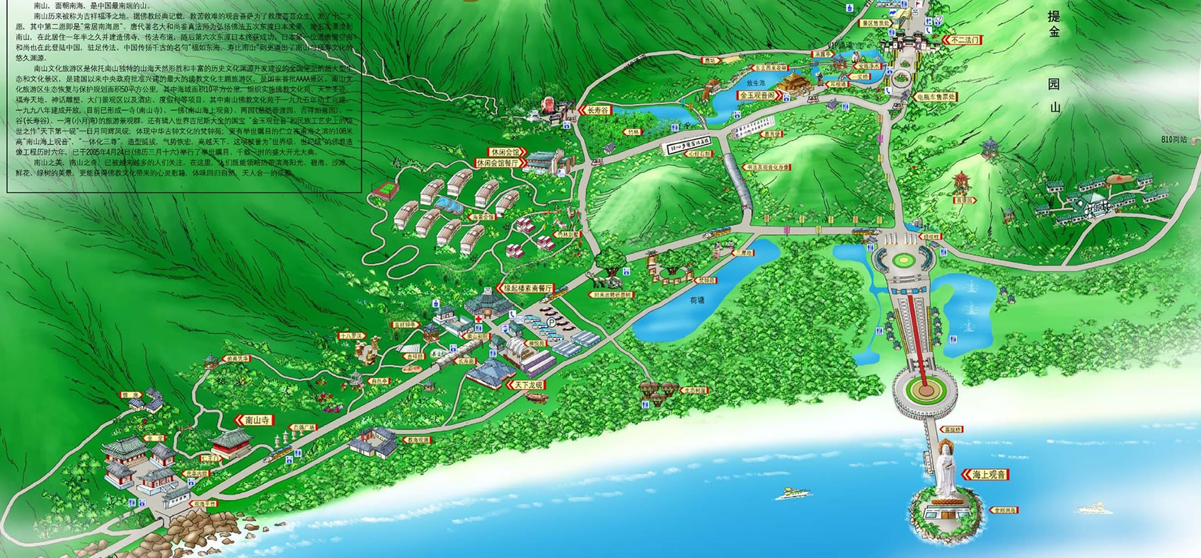 三亞南山風(fēng)景區(qū)是國家旅游局確定的“中國旅游業(yè)發(fā)展優(yōu)先項目”。它位于中國唯一的熱帶濱海城市三亞市的西部,是全國罕見的超大型文化和生態(tài)旅游園區(qū)。園區(qū)規(guī)劃面積五十平方公里,其中海域面積十多平方公里,由美國紐約國際城市設(shè)計公司統(tǒng)籌規(guī)劃,美國經(jīng)濟咨詢聯(lián)合公司提供可行性報告。項目內(nèi)容策劃分別由中國佛教文化研究所、中國民俗學(xué)會、中國歷史博物館、中央民族大學(xué)、中國環(huán)境科學(xué)院、中國科學(xué)院生態(tài)中心完成。該項目是海南省的重點建設(shè)項目,同時被三亞南山風(fēng)景區(qū)是國家旅游局確定的“中國旅游業(yè)發(fā)展優(yōu)先項目”。它位于中國唯一的熱帶濱海城市三亞市的西部,是全國罕見的超大型文化和生態(tài)旅游園區(qū)。園區(qū)規(guī)劃面積五十平方公里,其中海域面積十多平方公里,由美國紐約國際城市設(shè)計公司統(tǒng)籌規(guī)劃,美國經(jīng)濟咨詢聯(lián)合公司提供可行性報告。項目內(nèi)容策劃分別由中國佛教文化研究所、中國民俗學(xué)會、中國歷史博物館、中央民族大學(xué)、中國環(huán)境科學(xué)院、中國科學(xué)院生態(tài)中心完成。該項目是海南省的重點建設(shè)項目,同時被海南省授予“海南省生態(tài)建設(shè)示范工程”、“海南省生態(tài)旅游示范景區(qū)”,并得到了中央有關(guān)部門、佛教界、文化界的高度重視。它的建成填補了海南歷史文化旅游的空白,進一步突出海南大生態(tài)旅游優(yōu)勢,為中國旅游添光增彩。