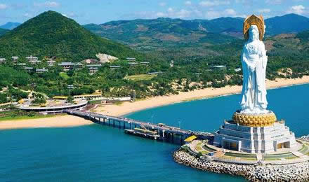 三亞南山海上觀音圣像敬造工程因其規(guī)模宏偉、意義殊勝、佛理底蘊豐富,被譽為“世界級、世紀(jì)級”的佛事工程。像體為正觀音的一體化三尊造型,寶相莊嚴(yán),腳踏一百零八瓣蓮花寶座,蓮花座下為金剛臺,金剛臺內(nèi)是面積達(dá)15000平方米的圓通寶殿。金剛洲由長280米的普濟橋與陸岸相連,并與面積達(dá)60000平方米的觀音廣場及廣場兩側(cè)主題公園,共同組成占地面積近30萬平方米的“觀音凈苑”景區(qū)。