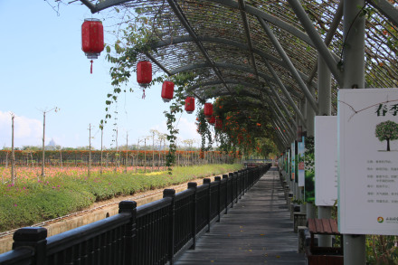 五色長廊長達200米,利用原生態(tài)爬藤類植物打造而成,炮仗花、使君子、百香果長年環(huán)繞于長廊頂,四季花開、碩果累累、香飄四溢,長廊腳基處龍船花爭先斗艷,形成了一座天然文化欣賞景觀。