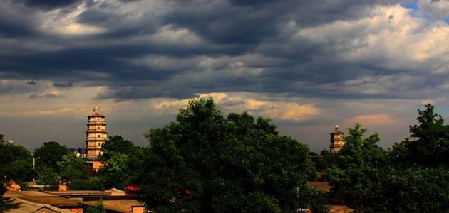 指矗立在城內(nèi)東北的雙塔。此雙塔建于遼代,這兩座塔的建成,民間有著動人的傳說。說是有兩位巧手的姑嫂,一夜之間建成,實際上是佛教文化產(chǎn)物。所謂“雙塔晴煙”,一是說:在風(fēng)和日麗的天氣里,遠(yuǎn)看雙塔正象幾縷青煙在蔚藍(lán)的天幕上裊裊升起。二是說:在晴朗的天日,雙塔頂部周圍能看到幾縷青煙。有詩記:“豐碑猶自紀(jì)金遼,雙塔凌增逼九霄,佛火不明鈴語寂,晴煙幾縷逐飄”。