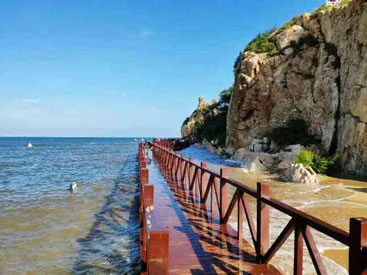 望海長廊,距鷹角亭50米,廊長70米。游人逗留廊中,遠眺渤海碧波,白云沙鷗,帆船巨艦;近賞淺水明澈,微波清蕩,看拾貝之人歡笑,聽大海之波濤,令人流連忘返。海邊建“浴日亭”,其匾額為嚴(yán)濟慈先生所寫。廊中彩繪雕梁畫柱,栩栩如生。兩側(cè)是由方亭和八角亭組成,分別采用了古代園林常見構(gòu)景手段—借景和透景的方法,吸收了北京頤和園和承德外八廟長廊的特點,繪畫了北戴河24景和北戴河206個民間故事傳說,以花鳥、魚蟲、人物等不同圖案,這種彩繪叫做“蘇式彩繪”。高于蘇式彩繪的要屬“旋子彩繪”畫面用簡化式的渦卷瓣旋花,有時也可以畫龍鳳,一般用于次要宮殿式寺廟中。等級最高的彩繪要屬“和璽彩繪”。中間的畫面由不同的龍或鳳的圖案組成,間補以花卉圖案,金碧輝煌,十分壯麗。 |