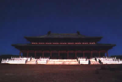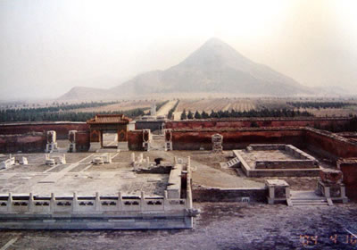 入關(guān)第一帝世祖順治皇帝的孝陵位于南起金星山,北達(dá)昌瑞山主峰的中軸線上,其余皇帝陵寢則以孝陵為中軸線按照“居中為尊”、“長幼有序”、“尊卑有別”的傳統(tǒng)觀念依山勢在孝陵的兩側(cè)呈扇形東西排列開來。各陵按規(guī)制營建了一系列建筑,總體布局為"前朝后寢"!鞍俪邽樾危С邽閯荨钡膶徝浪枷胴灤┯诿恳蛔陮嫿ㄖ。