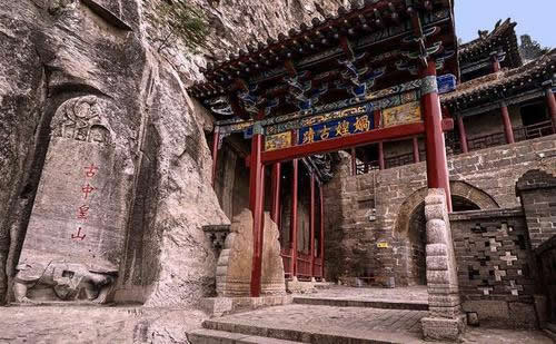 媧皇宮山門,坐東朝西,有三孔磚砌拱門組成。兩邊兒對聯(lián)寫著:鳳山名隆仙島;神仙勢壓十洲。橫批是:蓬壺仙境。進(jìn)了門是木牌坊,上額書寫“媧皇古跡”。牌坊西是皮瘍廟,塑著皮瘍王和魯班的神像。牌坊東樹一通古牌,上寫《古中皇山》。走過牌坊,東面峭壁上有北齊時的磨崖刻經(jīng)。再往前走是石券門,頂上建鼓樓。券額上刻著“中州勝景”四個大字 。