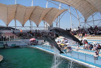 海豚表演館于2000年5月1日正式營業(yè),投資近6000萬元人民幣,占地面積約3000平方米。三面環(huán)座的看臺可同時(shí)容納2000名游客,站在看臺極目遠(yuǎn)眺,表演池和大海仿佛融為一體。在優(yōu)美音樂的伴隨下,不僅可以欣賞到海豚的水中華爾茲、空中頂球、跳圈、跨桿、環(huán)場鞠躬跳等高難度的精彩表演;還可以領(lǐng)略海獅投籃、水中霹靂舞、中國功夫等出色的演技;同時(shí)您還有機(jī)會親身觸摸海豚,與它握手交流,共同感受人與自然默契相通的美好境界。