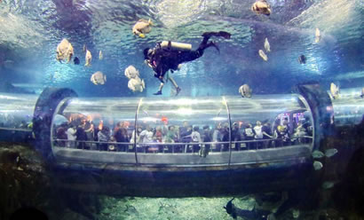 海底世界水族館飼養(yǎng)著來自世界各地的海洋動物200多種,共10,000多艉(頭),其中有大量國家一級、二級珍稀保護(hù)動物,檸檬鯊、豹紋鯊、護(hù)士鯊、海豚、江豚、綠海龜、海獅、海豹、蝠鲼、海狗供游人觀賞。270度環(huán)形的亞克力玻璃圍成的海底隧道全長100米左右,五光十色的珊瑚環(huán)繞在您的周圍,迷人的海底動植物盡收眼底。透過窗口還可以看到一個(gè)古羅馬被海水淹沒城市的石像造景。海豚表演館占地面積1萬平方米,建筑面積3,000平方米,總貯水量200萬千克,能同時(shí)容納2000多人同時(shí)觀看表演,以展示生活在海洋中哺乳動物的海獸表演為主,是一座具有國際標(biāo)準(zhǔn)的海洋動物表演劇場。游客在此可以看到聰明可愛的海豚和滑稽可笑的海獅聯(lián)袂上演精彩紛呈的各項(xiàng)表演:海獅獻(xiàn)上迪斯科、倒立平衡、一獅兩球、套彩圈、單手倒立、頂球過障礙、親吻、水中交誼舞等一系列惟妙惟肖的表演;海豚上演的水中芭蕾舞、踢足球、環(huán)場鞠躬跳躍、伴著樂曲引吭高歌以及充分展示海豚智力的各種表演活動。