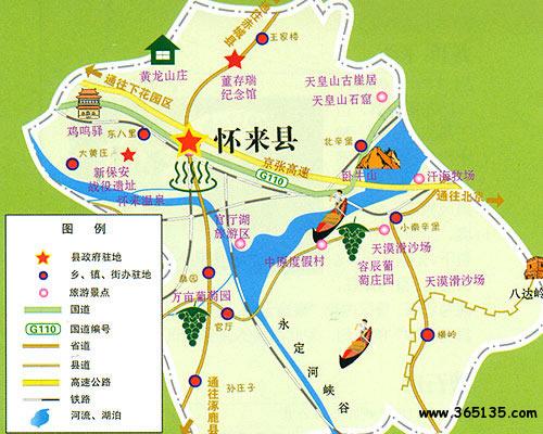 生態(tài)環(huán)境良好:該縣地處北京上風(fēng)上水,空氣清新,山清水秀,景色怡人,具有良好的生態(tài)環(huán)境。全縣林地面積129.5萬多畝,森林覆蓋率達(dá)到30.4%。位于懷來盆地中央的官廳水庫猶如一顆璀璨的明珠鑲嵌其中,環(huán)水庫周圍擁有梨園、海棠園、葡萄園等眾多花果園,臥牛山旅游度假、太師莊休閑度假、永定河峽谷漂流、天漠滑沙旅游多個各具特色的旅游景點、景區(qū)交叉點綴。集葡萄種植、加工、旅游于一體的容辰葡萄莊園,被國家批準(zhǔn)為首批農(nóng)業(yè)旅游示范點。天皇山、白龍?zhí)兜茸匀伙L(fēng)景區(qū),植被茂盛,風(fēng)景秀美。黃龍山莊花香幽遠(yuǎn),生態(tài)觀光獨具特色。
