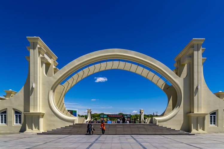 太陽島大門即太陽之門,坐落在太陽島西部主入口處。太陽門全長68米,兩端向太陽石方向環(huán)抱,主門高12.03米。大門為一大四小五個(gè)橢圓拱型門相連組成,其造型以新藝術(shù)運(yùn)動(dòng)風(fēng)格的建筑語言為主,并揉以其他風(fēng)格的藝術(shù)語言,其創(chuàng)意主題為“太陽的窗口”。中間的拱型大門和太陽島巨石在同一中軸線上,行進(jìn)方向?yàn)檎龞|正西,由此可以面向日出日落,四座小拱門中矗立著四座雕塑。門前的巨石,坐落在光輝四射的太陽圖案中心,腳下是模擬的哈爾濱市街區(qū)圖。
