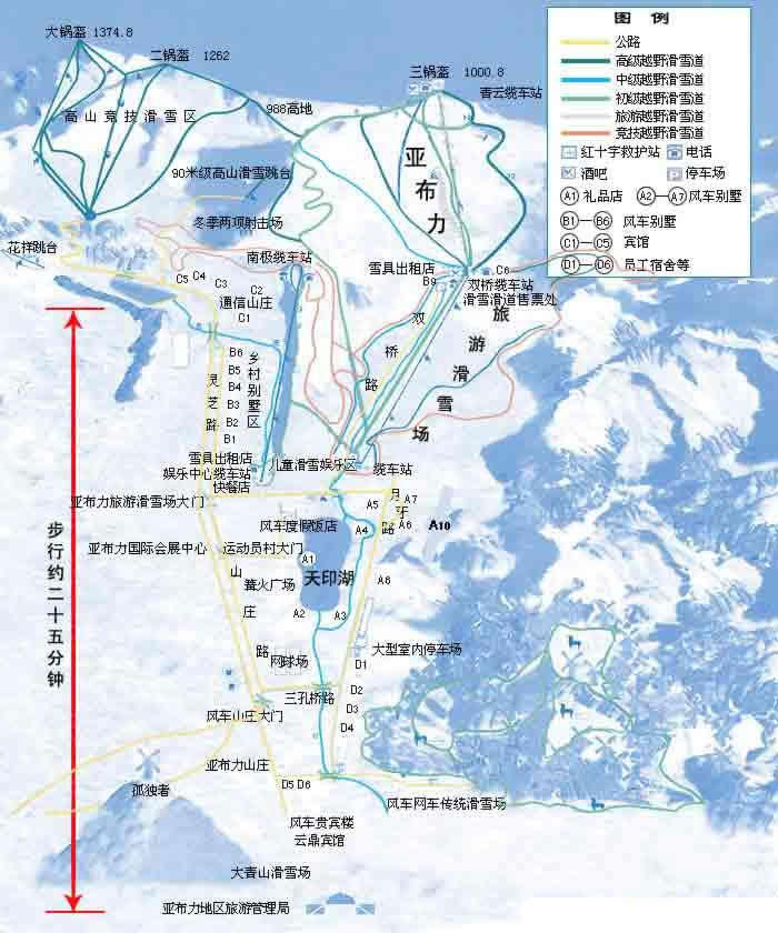亞布力滑雪旅游度假區(qū)由具有國際標(biāo)準(zhǔn)的高山競技滑雪區(qū)和旅游滑雪區(qū)兩大部分組成,占地面積22.55平方公里。在大鍋盔(海拔1374米)、二鍋盔(海拔1262米)和二鍋盔與三鍋盔之間的海拔988米高地處修建了具有國際標(biāo)準(zhǔn)的高山競技滑雪場(chǎng),有9條高山滑雪道,7條越野滑雪道,6條滑雪纜車和花樣跳臺(tái),90米級(jí)高山跳臺(tái),冬季兩項(xiàng)靶場(chǎng)及室內(nèi)體育館、運(yùn)動(dòng)員村等場(chǎng)地。在三鍋盔(海拔1000.8米)建成了大型旅游滑雪場(chǎng),擁有l(wèi)l條高、中、初級(jí)滑雪道,總長度30公里,其中有長5公里的5號(hào)雪道,l條5公里長的環(huán)形越野滑道,2公里長的全墊升氣墊船、雪地草地摩托及雪橇專用道,3條雙人吊椅式旅游纜車索道和3條拖牽式旅游索道。