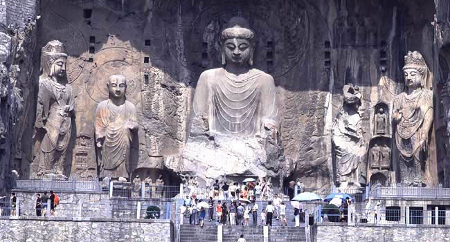 龍門石窟與甘肅敦煌莫高窟、山西大同云岡石窟并稱為“中國三大石刻藝術(shù)寶庫”。石窟始鑿于北魏孝文帝時(公元471~477年),歷經(jīng)400余年才建成,迄今已有1500年的歷史,龍門石窟南北長約1公里,現(xiàn)存石窟1300多個,窟龕2345個,題記和碑刻3600余品,佛塔50余座,佛像97000余尊。其中以賓陽中洞、奉先寺和古陽洞最具有代表性。