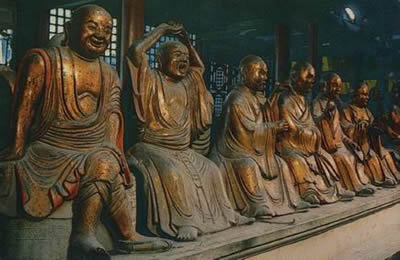 走進(jìn)羅漢堂,無(wú)不被它們的生動(dòng)形象所感染。只見(jiàn)有的盤(pán)腿端坐,有的臥石看天,有的研讀佛經(jīng),有的驅(qū)邪除惡。表情上,有的勇武,有的溫良,有的天真憨厚,有的飽經(jīng)滄桑,個(gè)個(gè)維妙維肖,活靈活現(xiàn)。如第463尊羅漢是颯陀怒尊者,四周有6個(gè)童子,為羅漢挖耳、掩嘴、遮眼等,稱(chēng)“六賊戲彌勒”。六賊即眼、耳、鼻、舌、身、意。它告誡佛門(mén)弟子,不要為凡情所染。塑像中把孩子的天真爛漫,嬌稚頑皮和羅漢的慈祥憨厚的神態(tài)刻化得淋漓盡致,讓人們從心底發(fā)出贊嘆的笑聲。