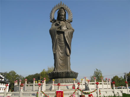 觀音菩薩為雙面造型,黃銅鑄造,周?chē)菨h白玉欄桿,像高18.8米,立于一個(gè)3米高的蓮臺(tái)之上,重達(dá)20噸,雙面觀音為二臂正觀音基本形,也稱(chēng)為圣觀音像。