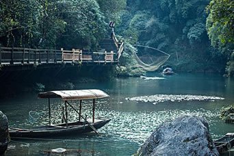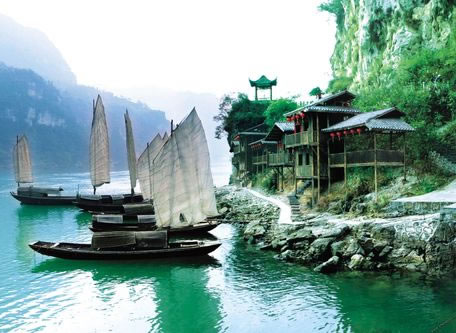三峽人家,依山傍水,風情如畫:傳統(tǒng)的三峽吊腳樓點綴于山水之間,久違的古帆船、烏篷船安靜地泊在三峽人家門前,溪邊少女揮著棒槌在清洗衣服,江面上悠然的漁家在撒網打魚……千百年來流傳不衰的各種習俗風情體現(xiàn)著峽江人民的質樸好客。