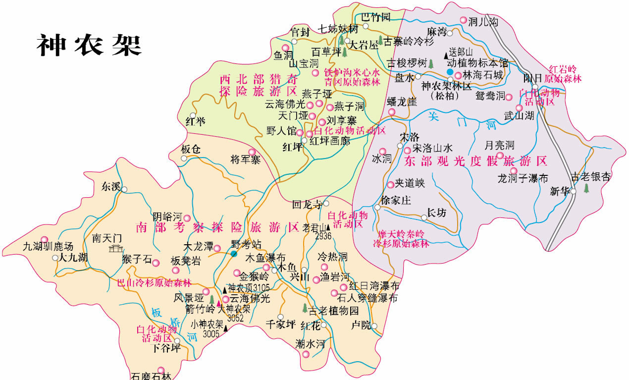 神農(nóng)架是位于湖北省西部一片群峰聳立的高大山地,橫亙于長江、漢水之間,方圓3250平方公里,相傳因上古的神農(nóng)氏在此搭架上山采藥而得名。景區(qū)山峰均在海拔3010米以上,堪稱“華中屋脊”。是以秀綠的亞高山自然風光,多樣的動植物種,人與自然和諧共存為主題的森林生態(tài)旅游區(qū)! 神農(nóng)架主要景點有神農(nóng)頂、風景埡、板壁巖、瞭望塔、小龍?zhí)、大龍(zhí)丁⒔鸷飵X等,以原始、神秘聞名于世,區(qū)內(nèi)山高谷深,林木茂密,氣候復雜多變,四季景色迷人。獨特的自然環(huán)境、人文歷史,造就了極其豐富、珍貴的自然和人文景觀,也孕育了景色宜人、鐘靈毓秀的旅游環(huán)境,有“神農(nóng)天園”之稱。