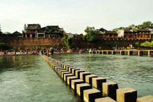 沱江跳巖古城人氣旺盛的風(fēng)景之一。這是一座古道橋梁,最早建于唐代,是乾州進(jìn)入當(dāng)時(shí)的五寨司城的必經(jīng)之路。清康熙四十三年(1704年)重修,仍是鳳凰至乾城的古道。跳巖最初由四十多個(gè)紅色長方體巖墩子組成,每墩相距二尺,便于鄉(xiāng)民肩挑背馱入城,但每年漲洪水時(shí)總有跳巖石墩被沖倒或沖走。民國時(shí)期,縣長李宗祺讓在跳巖上架以木板,這比以前行走更為方便,但仍連墩帶跳板被沖走。1950年,鳳凰縣人民政府成立,又重新補(bǔ)缺換新將石墩加大,將兩個(gè)墩子聯(lián)成一個(gè),跳巖全長100米,共15個(gè)巖墩,上鋪厚實(shí)的木板,并以鐵鏈在河底從巖上打眼,用鐵絲系緊,跳巖堅(jiān)固牢實(shí),保存完好,如今不僅仍是兩岸人民來往的要道,而且成為鳳凰古城頗具民族特色的亮麗風(fēng)景。2000年秋,為了進(jìn)一步改善群眾過河的條件,也為了更好地美化裝點(diǎn)古城,鳳凰縣撥款在老跳巖幾十米距離的河下游,新修了一道雙墩跳巖,兩排跳巖相隔一尺左右,一高一低,并排而立,橫跨江上,每排跳巖66墩,一字列于江面,每個(gè)石墩之間的距離也就一小步左右,來的走一排,去的走另一排。