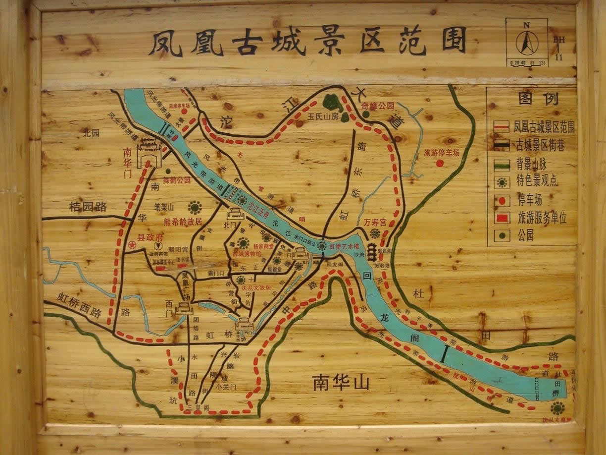 鳳凰古城分為新舊兩個(gè)城區(qū),老城依山傍水,清淺的沱江穿城而過,紅色砂巖砌成的城墻佇立在岸邊,南華山襯著古老的城樓,城樓還是清朝年間的,銹跡斑斑的鐵門。鳳凰古城北門城樓本名“璧輝門”,北城門下寬寬的河面上橫著一條窄窄的木橋,以石為墩,兩人對面都要側(cè)身而過,曾是出城的必經(jīng)通道。