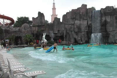 梯。輕舟蕩漾的環(huán)流河,洶涌澎湃的人造海浪,卡通境界的兒童池以及深水池、按摩池,是老少皆宜的歡樂(lè)海灣。