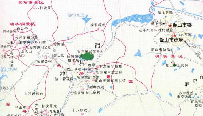 韶山市位于湖南省中部偏東的湘中丘陵區(qū),地理坐標(biāo)為東經(jīng)112°23′52〞-112°38′13〞、北緯27°51′40〞-28°1′53〞。位于湘鄉(xiāng)、寧鄉(xiāng)、湘潭交界處、距湘潭市40公里,距長沙市120公里,人口10萬。相傳舜帝南巡到此,見風(fēng)景優(yōu)美,遂奏韶樂,引鳳來儀,百鳥和鳴,又傳“韶氏三女得道于此,有鳳鳥銜天書到,女皆仙去。”韶山故此得名。現(xiàn)屬湘潭市。湖南省設(shè)韶山管理局。韶山,群山環(huán)抱,峰巒聳峙,氣勢磅礴,翠竹蒼松,田園俊秀,山川相趣。韶峰為南岳七十二峰之一,色彩神奇;青年水庫融藍(lán)天,映青山,碧波蕩漾;慈悅庵的六朝松,神秘的“西方山洞”——滴水洞、虎歇坪、滴水洞八景屏等著名景觀,點(diǎn)綴靈秀山川。