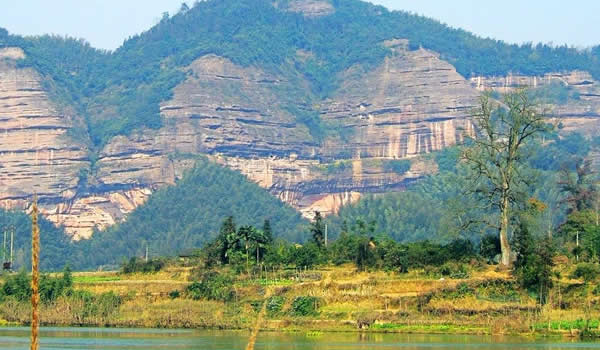 銅梁山位于湘潭縣石鼓鎮(zhèn)境內(nèi),山脈海拔700多米,地勢(shì)極為偏僻,正好處于湘潭縣與雙峰縣的交界之處。銅梁山名稱由來(lái)還有個(gè)美麗的傳說(shuō)。在雙峰縣井字鎮(zhèn)與湘潭縣、湘鄉(xiāng)市交界處,有一座大山叫昌山。主峰靈應(yīng)峰海拔755.1米,是南岳72峰之一。在主峰與鷹尖石之間,橫臥著一條長(zhǎng)達(dá)2公里的一字形平脊嶺,當(dāng)?shù)厝私兴?ldquo;一字大脊”。相傳有一仙人挑著兩個(gè)大小不一的籮筐,掌燈時(shí)分就來(lái)到了大山腳下的花山村。熱情好客的花山人見(jiàn)了這位外來(lái)客人,格外歡喜,他們以美酒佳肴相陪,不知不覺(jué)已到雞鳴。仙人突然想起師父“雞鳴前一定要翻過(guò)大山”的教誨,趲告辭,挑起擔(dān)子飛也似的上山去。可是,送客的花山人一會(huì)兒便發(fā)現(xiàn),那人的擔(dān)子擱在了山頂,扁擔(dān)成了一條“一字脊”,兩個(gè)籮筐便成了一字脊兩端的“巒柱”,形似一個(gè)巨大的銅梁。因此,銅梁山這個(gè)美名便叫開了。