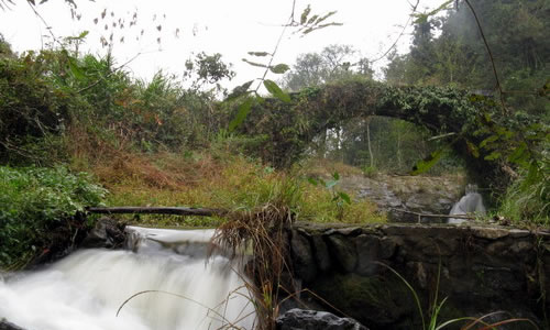仙人橋景點位于攸縣酒埠江風景區(qū)太陽山景區(qū)漕泊鄉(xiāng)的七里村,屬典型的客斯特地貌,是原有地下石灰?guī)r溶洞在地殼抬升作用下大部分頂蓋塌陷以后,保留下來的一塊頂蓋形成的一座天然石橋。石橋下洞高60余米,橋面長約20米,兩頭窄,中間寬,最窄處僅50厘米左右,最薄處也僅2米。此橋天造地設,鬼斧神工。