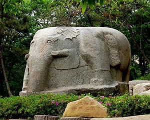 從龍洞西行,在林木掩映的山坡上.屹立著一座碩大的漢代圓雕石象。石象依一塊花崗巖巨石的自然形狀雕刻而成雕刻而成,象身高2.6米,長(zhǎng)4.8米,背寬3.5米,石像耳闊體肥,四肢健壯,長(zhǎng)鼻巨牙、卷尾粗足,形態(tài)雄奇,豐滿肥碩。象身西側(cè)有一高0.88米,寬0.49米,深0.2厘米的陰鑿凹面,系未見(jiàn)刻銘的題榜,象身東側(cè)以陰線刻一高1.13米,寬0.62米的方框,內(nèi)刻隸書“象石”字樣,在刻銘與象前腿之間,還鑿刻了一個(gè)頭梳“丁”字形發(fā)髻,手持勾鞭,腳帶鐐銬高0.92米的馴象奴。象的四足均踏著蓮花,體現(xiàn)了佛教中六牙白象王在水中步步蓮花的故事傳說(shuō)。它是孔望山漢代佛教造像有機(jī)整體中不可分割的一部分。此石系目前我國(guó)發(fā)現(xiàn)的東漢時(shí)期最大的圓雕石刻,石象南側(cè)約一百五十米處,還有與此同時(shí)期的石雕鎮(zhèn)海蛙,此蛙為當(dāng)時(shí)鎮(zhèn)海之物。體長(zhǎng)240厘米,寬220厘米,通高110厘米,石蛙頭部略損,前兩肢半殘,眼睛陰刻,背上遍刻陰線鱗紋。這兩座石雕,別特是石象,氣勢(shì)雄偉,造型精美。均為我國(guó)珍貴的石刻藝術(shù)珍品。