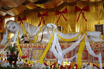 釋迦牟尼涅槃像由名貴的緬甸白玉精雕細(xì)琢而成。白玉毛料1999年在緬甸發(fā)現(xiàn),歷經(jīng)三年艱苦開采,始現(xiàn)于世。玉料為一塊完整一體的純天然玉料。據(jù)玉材的天然造型,經(jīng)過精心設(shè)計(jì),由德純藝高的工匠歷兩年時(shí)間精工雕成。佛像長8.9米,高2.45米,總寬1.35米,體型比例均確。玉佛全身鑲嵌有1500多粒紅、藍(lán)、紫晶寶石和翡翠,衣紋和蓮花臺(tái)由24K黃金鎦金而成,彩繪部分采用天然石色彩畫而成。