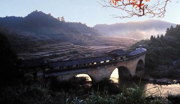 玉帶橋:因其弧形如玉帶,故名。玉帶橋?yàn)楫?dāng)?shù)馗晃逃囡L(fēng)歧募資建于清乾隆五年(公元1740年),又名“風(fēng)歧橋”。玉帶橋?yàn)槎杖孜輼鞘焦皹颍瑯蛏沓苫⌒,橋長(zhǎng)88.15米,是江南現(xiàn)存最長(zhǎng)的弧形廊橋,它以結(jié)構(gòu)獨(dú)特,氣勢(shì)雄偉而聞名贛粵。留下了“遠(yuǎn)近聞名玉帶橋,兩岸峻峰入云霄。奔騰河水瀉千里,玉帶飛鎮(zhèn)兩山腰”的贊譽(yù)。