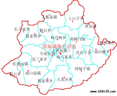 鎮(zhèn):清原鎮(zhèn)、紅透山鎮(zhèn)、草市鎮(zhèn)、英額門鎮(zhèn)、南口前鎮(zhèn)、南山城鎮(zhèn)、灣甸子鎮(zhèn)、大孤家鎮(zhèn)、夏家堡鎮(zhèn)