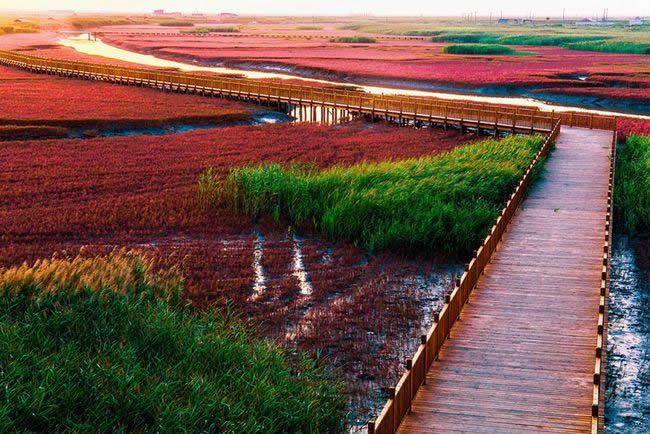 紅海灘國(guó)家風(fēng)景廊道它位于遼寧省盤(pán)錦紅海灘濕地旅游度假區(qū),南起二界溝混江溝大橋,北至紅海灘濕地旅游度假區(qū)接官?gòu)d大橋與旅游路接口,全長(zhǎng)18.115公里。是獨(dú)一無(wú)二的“世界紅色海岸線”,也被稱為“中國(guó)最精彩的休閑廊道”和“中國(guó)最浪漫的游憩海岸線”。中國(guó)婚協(xié)授予了紅海灘國(guó)家風(fēng)景廊道“中國(guó)婚禮文化產(chǎn)業(yè)基地”榮譽(yù)。