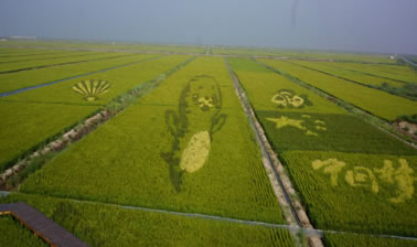 稻田作畫(huà),又稱稻田彩繪,主要是以黃色、綠色和紫色葉水稻種植于水田中,栽種時(shí)先在農(nóng)田里用傳統(tǒng)畫(huà)線器,畫(huà)出九宮格,依圖樣定出坐標(biāo),再牽線繪出圖樣或字體輪廓,最后種上黃色秧苗,隨著水稻生長(zhǎng),就會(huì)呈現(xiàn)出預(yù)先規(guī)劃的圖形或文字。在不同的位置栽種不同的稻米品種,通過(guò)精細(xì)巧妙的排列組合,不同顏色葉子的稻米會(huì)在生長(zhǎng)過(guò)程中自然鋪陳出一幅幅美麗的圖畫(huà)。稻田彩繪可以維持兩個(gè)半月左右。