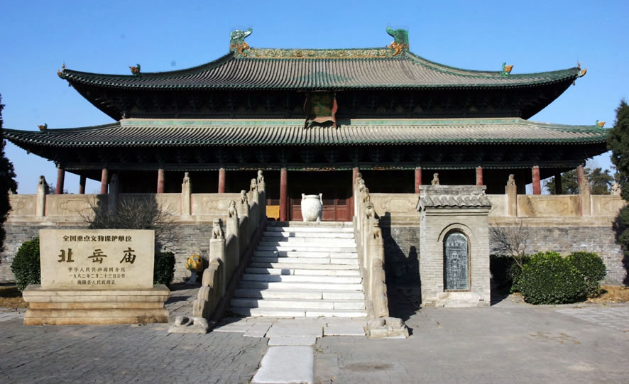 北岳廟,漢稱北岳祠,唐稱北岳安天王廟,宋稱北岳安天元圣帝廟,元稱北岳安天大貞元圣帝廟,到明時(shí)去掉歷代所加封號(hào),改稱為北岳廟,坐落在河北省保定市曲陽縣城西部恒州鎮(zhèn)北岳路2號(hào),始建于南北朝時(shí)期北魏景明、正始年間(500—512年),清順治十七年(1660年)以前,北岳廟一直是歷代封建帝王祭祀北岳恒山之神的場(chǎng)所,總占地面積為173982平方米。北岳廟建筑格局呈坐北朝南的“田”字形,采用的是以中軸線為主,兩廂對(duì)稱的傳統(tǒng)建筑形式。廟內(nèi)主體建筑德寧之殿在中軸線北端,往南依次建有飛石殿、三山門、凌霄門、御香亭、朝岳門、牌坊、石橋等。北岳廟是一座內(nèi)涵豐厚的文化藝術(shù)殿堂,集古建、繪畫、書法、石雕、定瓷等藝術(shù)于一身。北岳廟碑刻對(duì)研究所處時(shí)代的政治、經(jīng)濟(jì)、文化以及書法藝術(shù)的演變,提供了珍貴的實(shí)物資料。