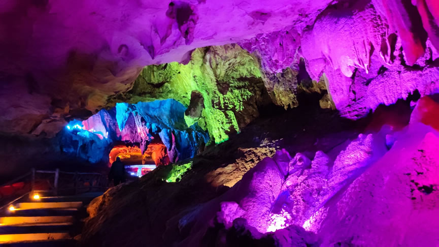 - 景區(qū)核心景點,全長約1600米,洞內(nèi)鐘乳石千姿百態(tài),色彩斑斕。