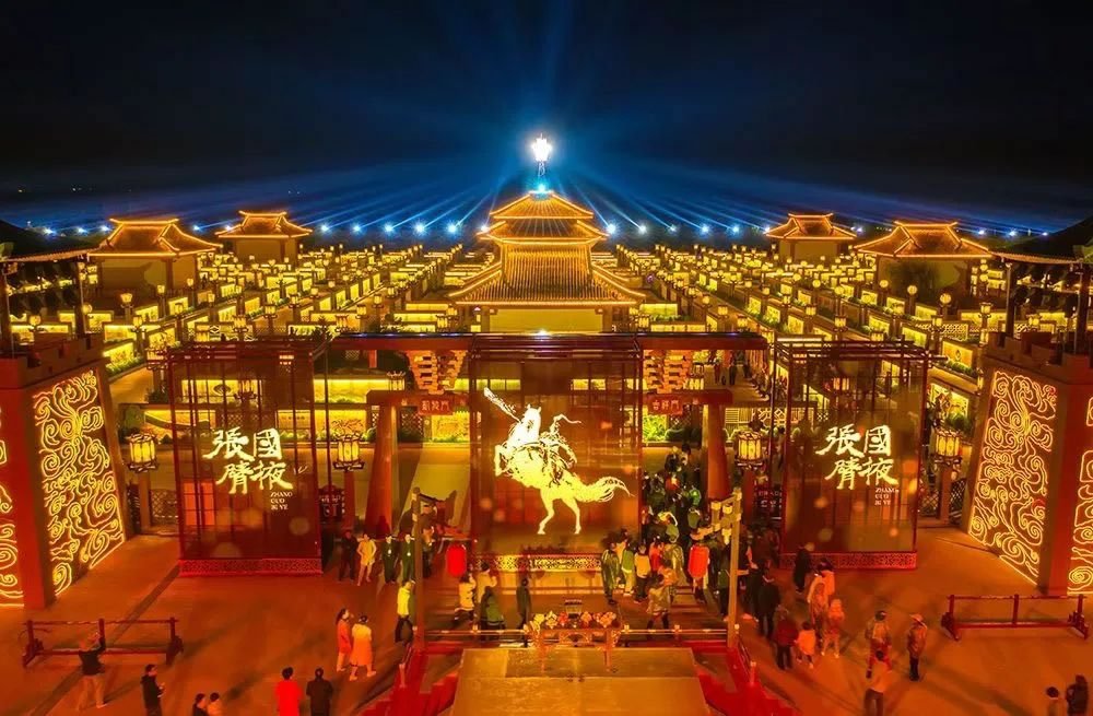 - 九曲黃河燈陣:占地150畝,全長(zhǎng)2.4公里,按九宮八卦布局九大殿(關(guān)公殿、元始天尊殿等),設(shè)365桿旗、365盞燈對(duì)應(yīng)全年天數(shù),700余面文化墻融合二十四節(jié)氣、十二生肖、二十八星宿等傳統(tǒng)文化元素,夜間燈光秀與實(shí)景演藝《張國(guó)臂掖》結(jié)合,打造沉浸式漢唐市井體驗(yàn)。