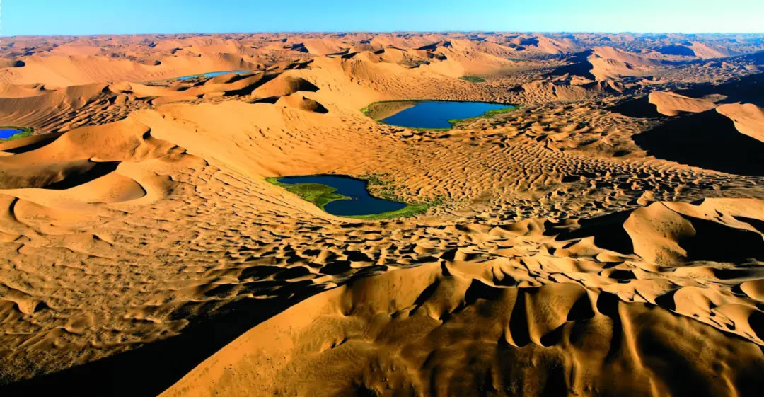 面積約4.43萬平方千米,是中國第三大沙漠。流動沙丘占全部沙漠面積的83%。中部有高大沙山,一般高200-300m,最高的達500m。高大沙山間的低地有144個內(nèi)陸小湖。巴丹吉林沙漠有“中國最美的沙漠”的美稱。是阿拉善世界沙漠地質(zhì)公園的核心區(qū)域。