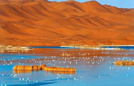 當(dāng)?shù)啬撩穹Q之為“月亮湖”、“中國湖”,因為該湖從東邊看好像一輪彎彎的月亮靜靜地傾訴著古老的故事,從西邊沙丘上看好像一幅中國地圖,氣勢磅礴。