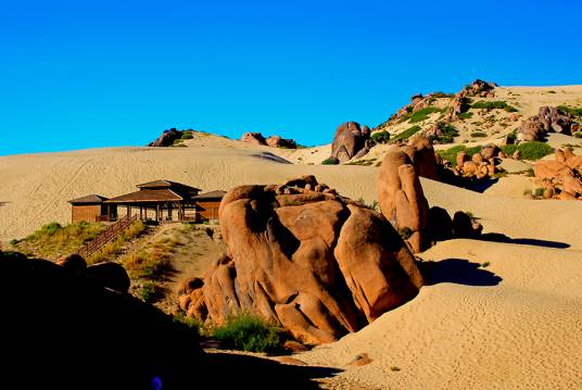 赤峰市西拉沐淪河兩岸,是著名的科爾沁沙地的組成部分,有“八百里瀚海”之稱。翁牛特旗的其甘、布日敦、勃隆克山等地,是典型的科爾沁沙地發(fā)育區(qū)。到此旅游,既可以一睹“長河落日?qǐng)A,大漠孤煙直”的沙漠風(fēng)采,又可以體味沙漠與綠洲、湖泊相生相伴的沙地獨(dú)特景觀。