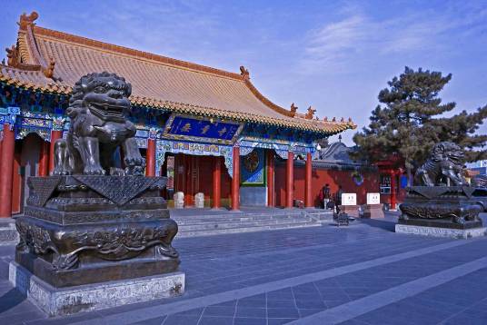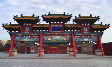 大召,明代稱“弘慈寺”,歷史上又有“銀佛寺”“大乘法輪召”“甘珠爾廟”“帝廟”等多種稱謂。大召,是一座大藏傳佛教寺院,是呼和浩特最早建成的黃教寺院,也是蒙古地區(qū)僅晚于美岱召的蒙古人皈依黃教初期所建的大型寺院之一,屬于格魯派(黃教)。占地面積約3萬平方米,其中建筑面積為8000多平方米。大召寺院座北向南,總體布局是伽藍七堂形制,由正院、東倉和西倉三大院落單位成,東西兩倉各有倉門,北端互通構(gòu)成環(huán)繞寺廟的甬道。主軸線上由山門、天王殿、菩提過殿、大雄寶殿和九間樓組成。大召的藏品豐富,堪稱大召“三絕”的銀佛、龍雕、壁畫佛殿內(nèi)的各種彩塑、金銅造像、晾佛節(jié)展開的巨幅唐卡、108部的甘珠爾經(jīng)卷,以及宗教活動使用的各種法器,面具等都是較珍貴的歷史文物和藝術珍品。
