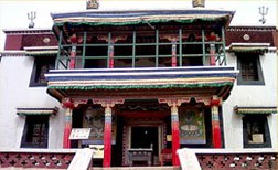 喇彌仁殿(菩提道學經(jīng)堂),又稱日木倫殿。建于光緒十八年(1892年),位于護法殿后邊西北高聳的山坡上,為教義戒律學部,這個學部在內(nèi)蒙地區(qū)藏傳佛教寺院中只有五當召設(shè)立。是召廟建筑群中建造年代最晚的建筑物。殿內(nèi)正中供奉銅鑄高九米的黃教創(chuàng)始人宗喀巴坐像。左右兩側(cè)塑其兩大弟子嘉曹杰和克珠杰塑像。兩側(cè)木龕內(nèi)有一千尊一模而成的宗喀巴塑像。二樓凸起的天窗既可容納高大的塑像,又可采納光線,顯示了獨具匠心的藏傳佛教寺廟建筑特點。