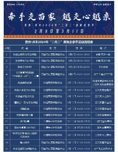 2024年3月9日至11日,貴州貞豐將迎來盛大的“二月二”苗族走親節(jié)活動。本次活動由貞豐縣苗學會主辦,貞豐縣雙峰文旅集團協辦。