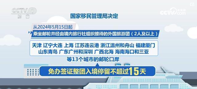 2024年5月15日起,乘坐郵輪并經(jīng)由境內(nèi)旅行社組織接待的外國(guó)旅游團(tuán)(2人及以上),可從天津、遼寧大連、上海、江蘇連云港、浙江溫州和舟山、福建廈門、山東青島、廣東廣州和深圳、廣西北海、海南?诤腿齺喌13個(gè)城市的郵輪口岸免辦簽證整團(tuán)入境停留不超過(guò)15天。旅游團(tuán)須隨同一郵輪前往下一港,直至本次郵輪出境,活動(dòng)范圍為沿海省(自治區(qū)、直轄市)和北京市! ∴]輪旅客“靠港即下、好來(lái)快走”