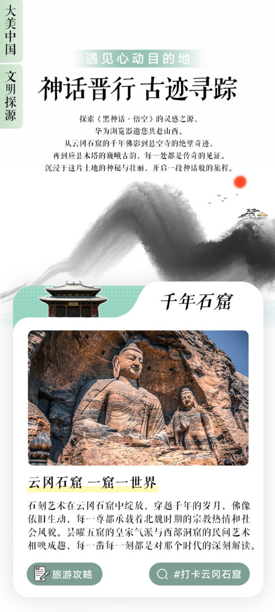 華為瀏覽器的“遇見心動目的地”專題還將于9月29日上線大美中國、文明探源、神話晉行專題,包括大同懸空寺、朔州崇福寺、應縣木塔、臨汾鐵佛寺等《黑神話:悟空》游戲中的取景地都會有相應的旅游攻略。專題會根據(jù)旅游的目的地和路線的不同,提供多種不同的行程方案,可以根據(jù)自身的實際情況進行挑選,讓我們的旅程變得無比充實!