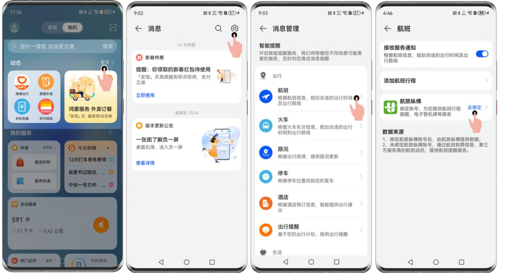 除了上面介紹的三個主要功能之外,華為手機的實用功能還有很多,比如華為Pura 70系列、Mate 60系列等機型只需要喚醒智慧助手小藝,就可以讓它根據(jù)目的地等條件編寫一篇使用的旅游攻略。甚至智慧識別判斷用戶是否需要出行服務,并通過卡片實時顯示高鐵、航班或者打車信息。通過手機負一屏,右劃一下,也可以很方便的調用“航旅縱橫”值機,或者“鐵路12306”乘坐高鐵。