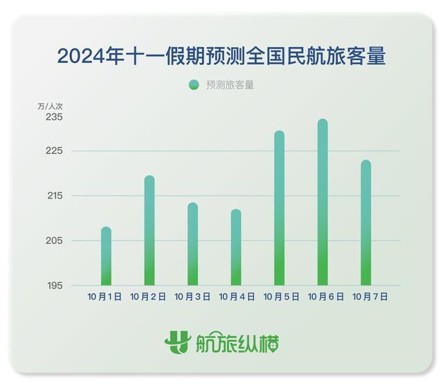 今年國慶旺季民航繼續(xù)呈“量升價跌”趨勢。據民航出行服務平臺“航旅縱橫”近日發(fā)布的報告顯示,2024年國慶假期期間(10月1日至10月7日)全國民航旅客量預計將超1565萬人次,日均旅客運輸量達223萬人次,同比2023年國慶假期增長7%,較2019年同期增長19%。