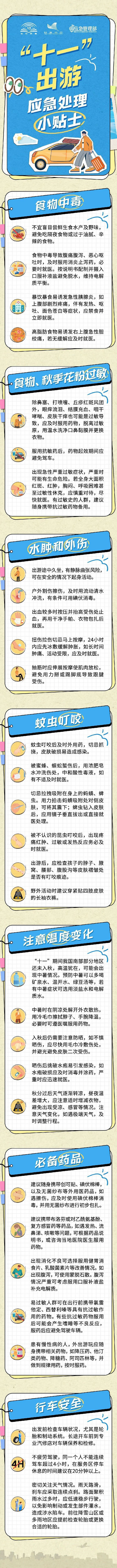 國慶假期馬上就到啦,相信很多人都有出游計(jì)劃。中國疾控中心聯(lián)合科普中國和應(yīng)急管理部,專門給大家準(zhǔn)備了一份《“十一”出游應(yīng)急處理小貼士》,祝大家過個(gè)愉快又安全的假期!