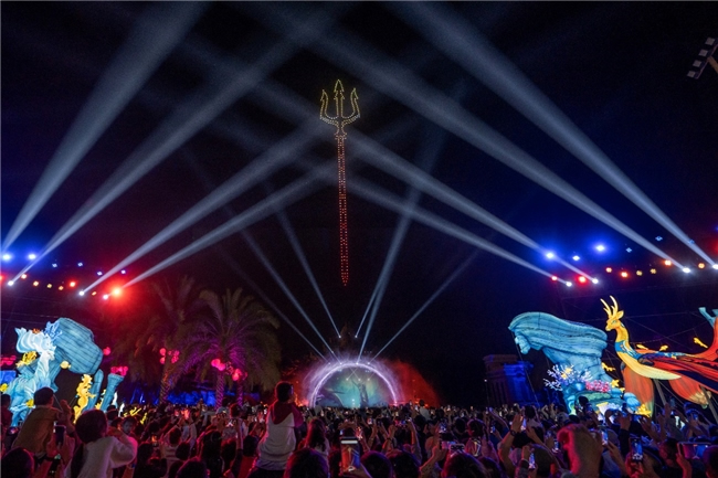 活動期間,每晚都會上演《深?駳g》無人機水幕秀。視頻內(nèi)容通過人工智能建模技術(shù),實現(xiàn)了角色形象的高精度三維重建,構(gòu)建出具有高度真實感和動態(tài)表現(xiàn)力的虛擬角色。隨著劇情的推進(jìn),數(shù)百架無人機在夜空中變幻多種圖案,點亮海棠夜空,演繹出獨屬于亞特蘭蒂斯的海底狂歡。