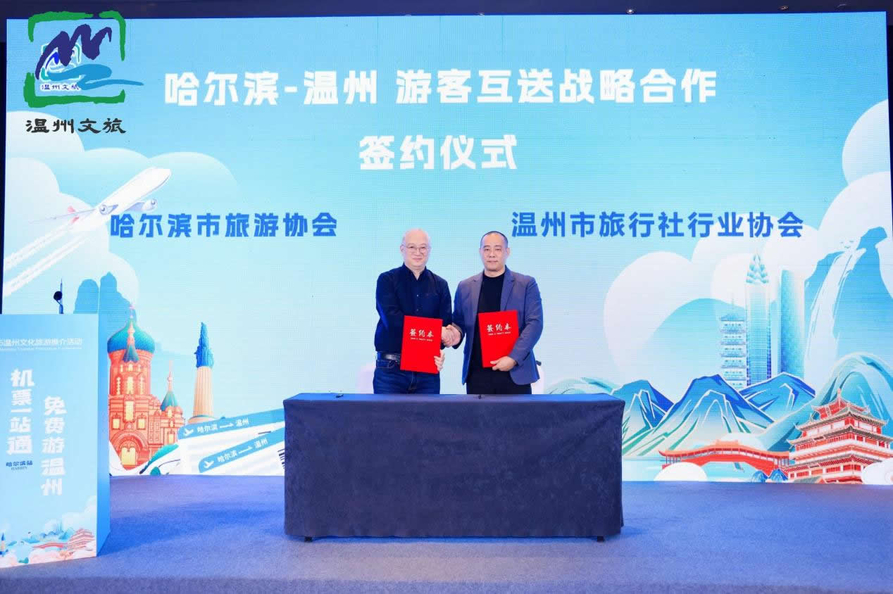 活動現(xiàn)場重點推介了“‘山江海’暢游之旅”“都市休閑美食體驗之旅”“文成泰順康養(yǎng)游”三大主題線路,并重磅推出“一張機票游溫州”政策:憑抵溫機票可7日內(nèi)可享受國有旅游景區(qū)首道門票免費和部分私營景區(qū)優(yōu)惠權(quán)益。除了鼓勵旅行社招徠境內(nèi)游客、港澳臺及境外游客,招徠大型團隊以及療休養(yǎng)團隊,部分縣市區(qū)、景區(qū)也針對旅行社市場推廣做出疊加獎勵,真正實現(xiàn)“一票多惠”,為沈陽市民提供高性價比出游選擇。為深化兩地合作,哈爾濱市旅游協(xié)會和溫州市旅行社行業(yè)協(xié)會共同簽署“機票一站通 免費游溫州”哈爾濱-溫州互送游客戰(zhàn)略合作協(xié)議。
