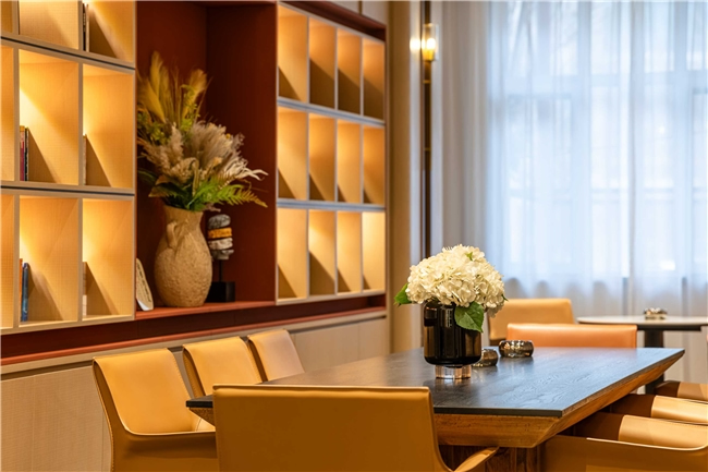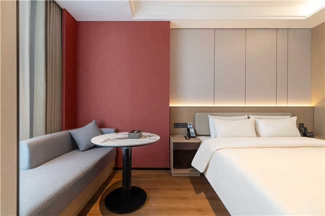 酒店共設(shè)125間豪華客房,涵蓋高級房、行政房、親子房及行政套房等多種房型。設(shè)計以“海棠紅”與“寶石紅”為主色調(diào),融合現(xiàn)代雅致與地域文化元素,營造淡泊素雅的藝術(shù)氛圍。客房配備智能語音助手、智能門鎖、燈光控制系統(tǒng)等科技設(shè)施,打造沉浸式智慧旅居空間。公共區(qū)域還設(shè)有大堂吧、書吧、茶室、中餐廳、會議室、健身房、洗衣房等配套設(shè)施,滿足賓客的多元需求。