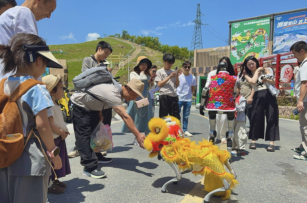 宇樹機(jī)器人與機(jī)器狗戰(zhàn)隊(duì)正在草坪上“營業(yè)”,科技感十足的巡游表演吸引大批游客圍觀。萌寵機(jī)器人不僅能隨音樂蹦迪,還能與小朋友擊掌互動,現(xiàn)場歡笑聲不斷。