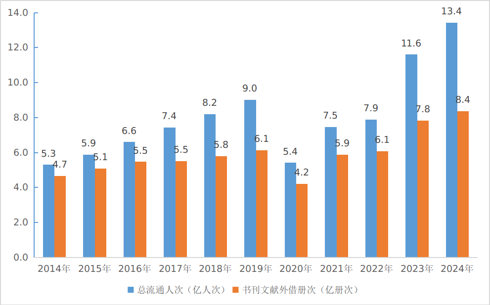 圖2:2014—2024年全國(guó)公共圖書館總流通人次及書刊外借冊(cè)次